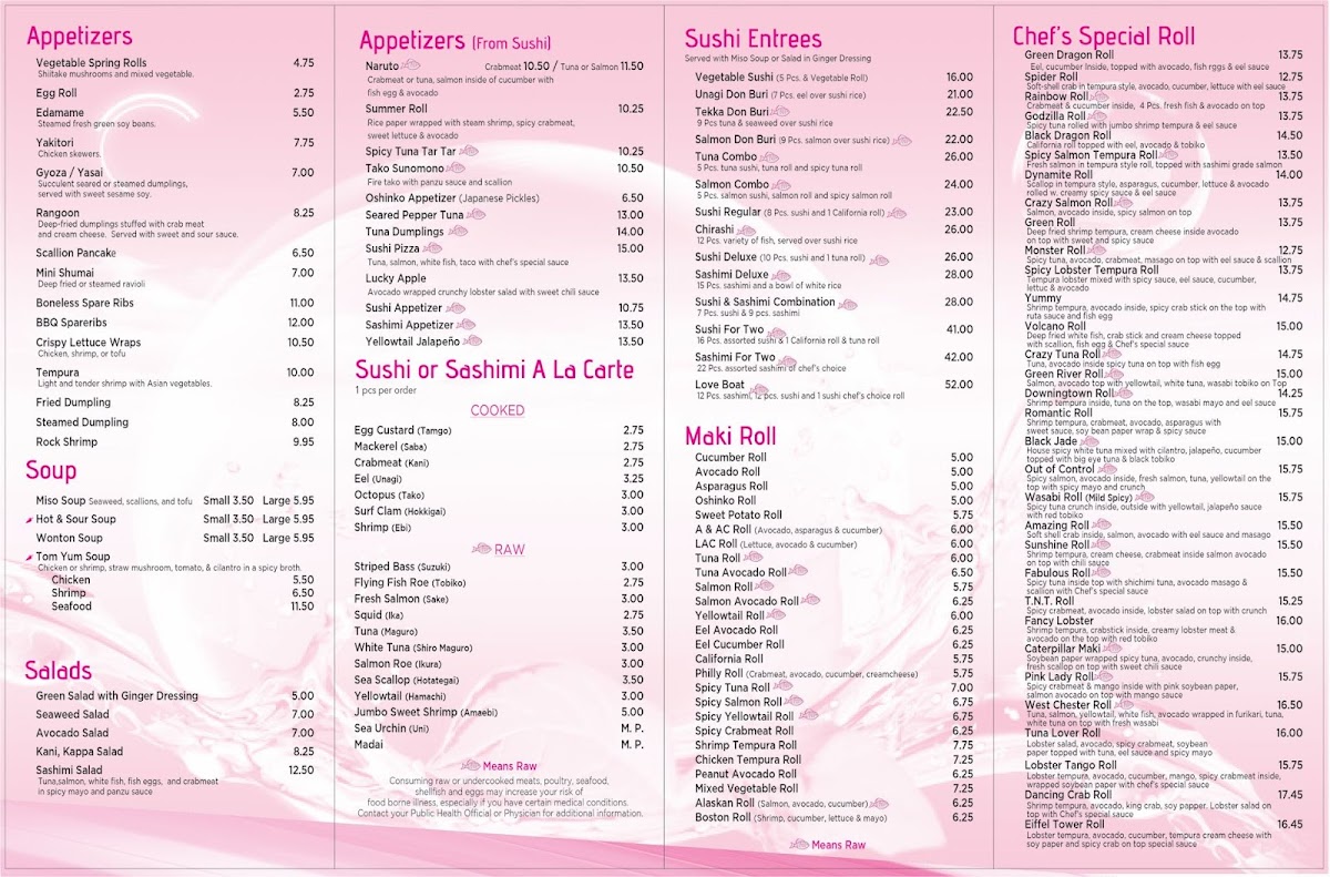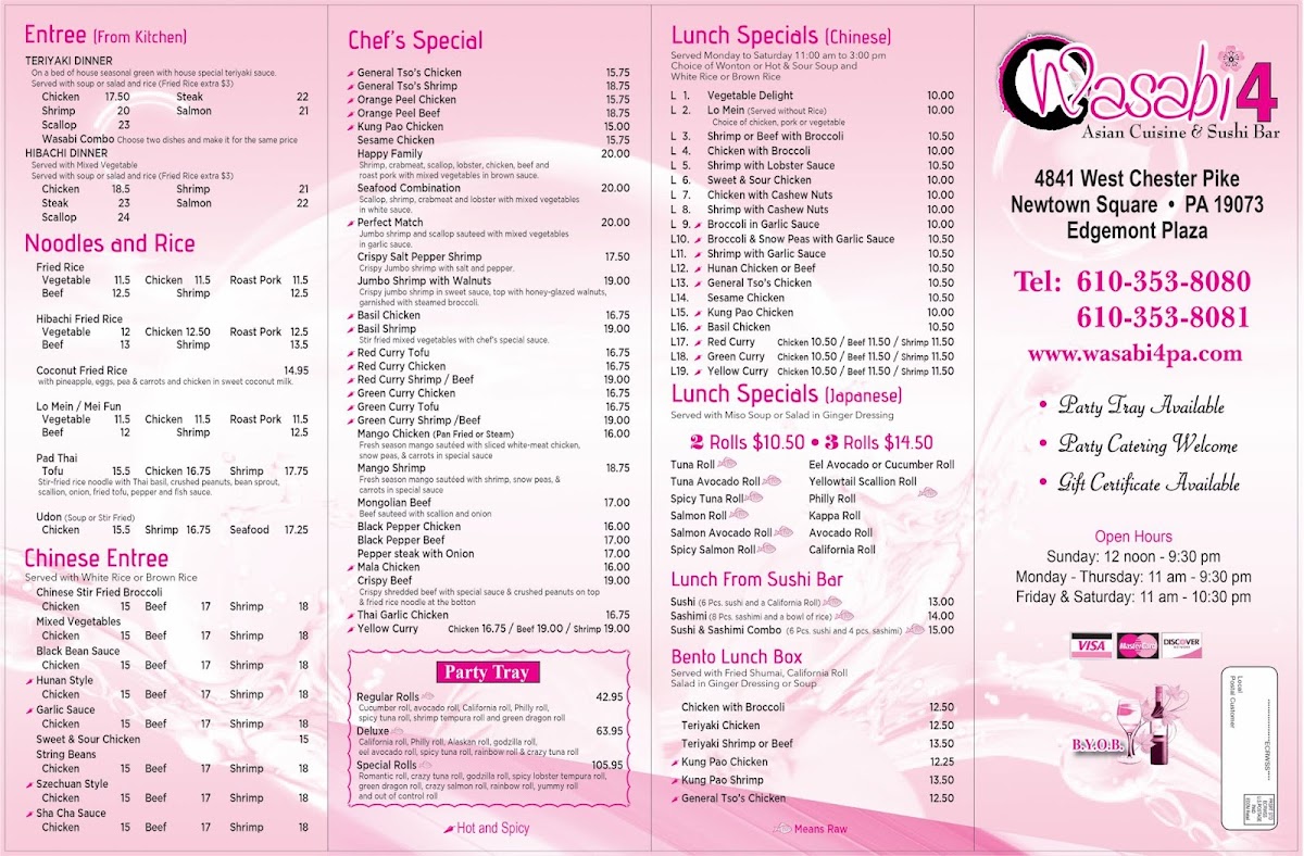 Wasabi 4 in Newtown Square offers an eclectic fusion of Japanese and Chinese dishes, catering to a variety of tastes. For appetizers, the Tuna Dumplings and Sushi Pizza are standout choices, with the Seared Pepper Tuna (App) and Naruto Salmon (App) offering a fresh, flavorful experience. Their sushi offerings, such as the Sushi Special 2 Roll, are also popular, and for something a bit more unique, the Dancing Crab Roll and Lobster Tango Roll are a must-try. If you're in the mood for Chinese cuisine, the restaurant offers hearty Dinner Combination Platters like Comb Beef W. Garlic Sauce and Comb Sesame Chicken, as well as Beef With Broccoli and Hunan Beef. For a lighter meal, their range of Fried Rice options like Hibachi Beef Fried Rice and Coconut Fried Rice will not disappoint. The Seafood Combination and Basil Shrimp shine in their Chef's Specialties. Pairing perfectly with these dishes, the Seaweed Salad and Miso Soup from the Japanese menu are refreshing. For lunch, Wasabi 4 offers quick but satisfying options, including the Sushi Deluxe and Shrimp Udon Soup. Overall, Wasabi 4’s menu offers a fantastic balance of classic and creative dishes from both Japanese and Chinese culinary traditions, ensuring there's something for everyone.