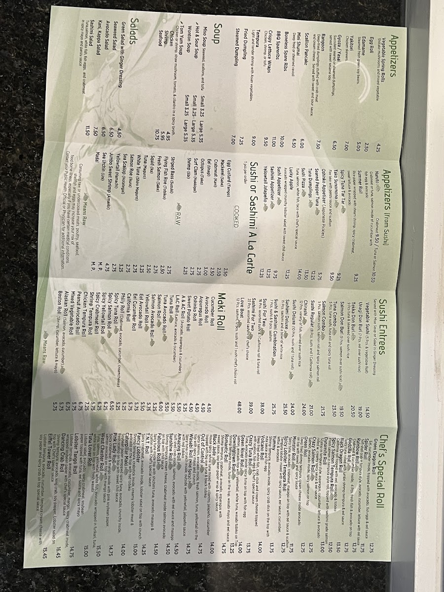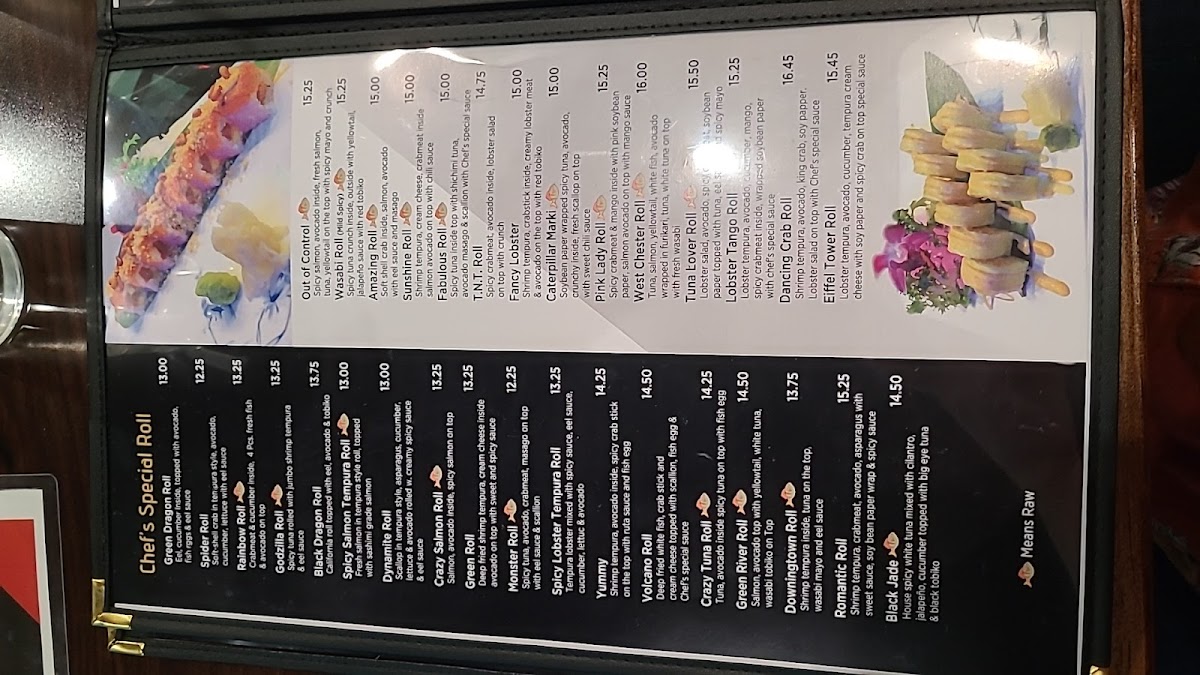 Romantic roll, crazy tuna roll, Godzilla roll, spicy lobster tempura roll,green dragon roll, crazy salmon roll, rainbow roll, yummy roll and out of control roll.