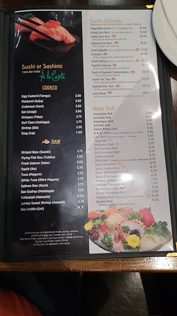 California roll, Philly roll, Alaskan roll, Godzilla roll, eel avocado roll, spicy tuna roll, rainbow roll and crazy tuna roll.